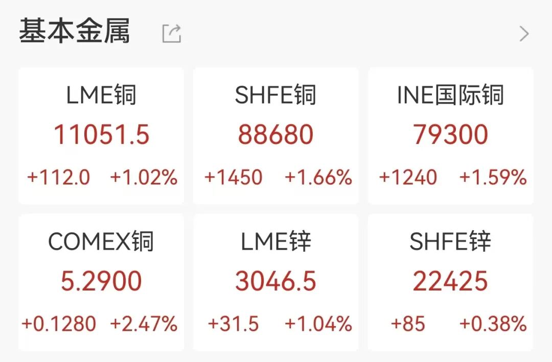 其他金属亦涨势突出,现货钯金日内大涨6%;LME铜价一度上涨2.5%,最高报11210美元/吨,突破10月高点,并创纪录新高。