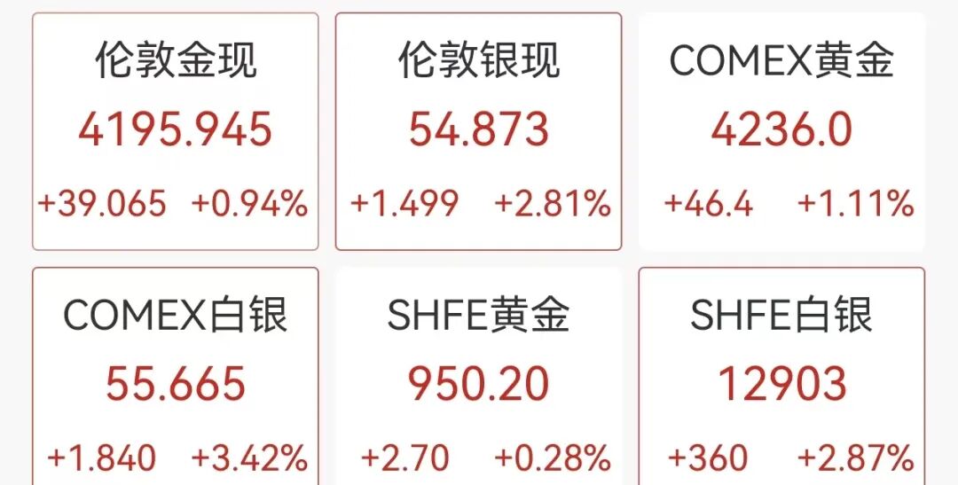 现货黄金向上触及4200美元,日内涨约1%。现货白银日内涨幅一度扩大至3%,上期所沪银期货也涨近2.9%,双双刷新历史新高;纽约期银涨2.8%。美股白银矿商跟随白银上涨,赫克拉矿业上涨4.4%,科埃尔矿业上涨3.6%,恩迪沃银业上涨6.5%。
