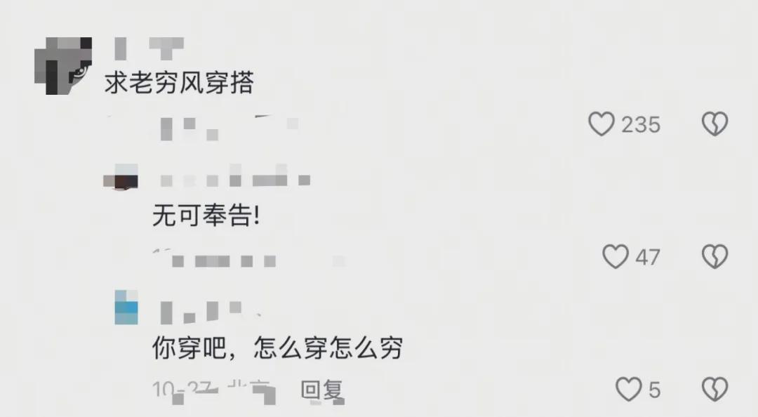 北漂PP自诩老穷风资深玩家,在他看来,老钱风是“不显山露水的贵气”,老穷风就是“坦坦荡荡的穷感”。“以前穷还要装阔,现在直接说‘我没钱’,反而能堵住所有人的嘴。”