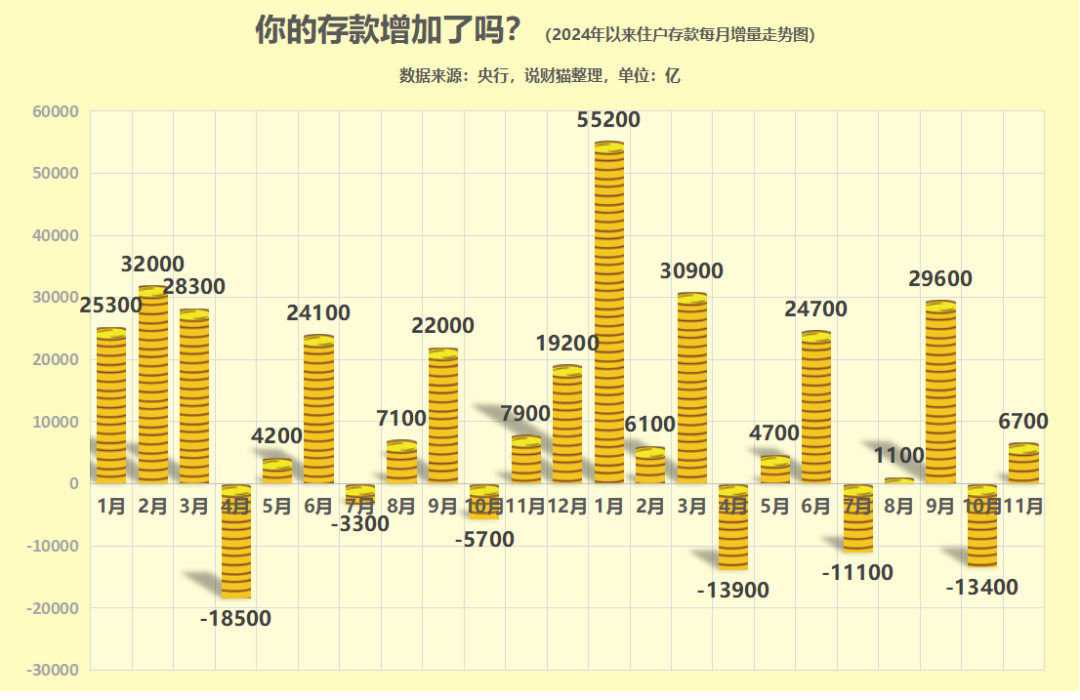 今年11月,住户存款新增6700亿,比去年同期少增1200亿。
