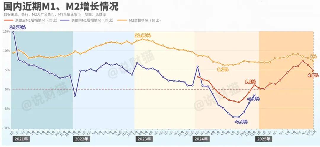 狭义货币M1增速4.9%,环比下滑幅度更是达到1.3%。