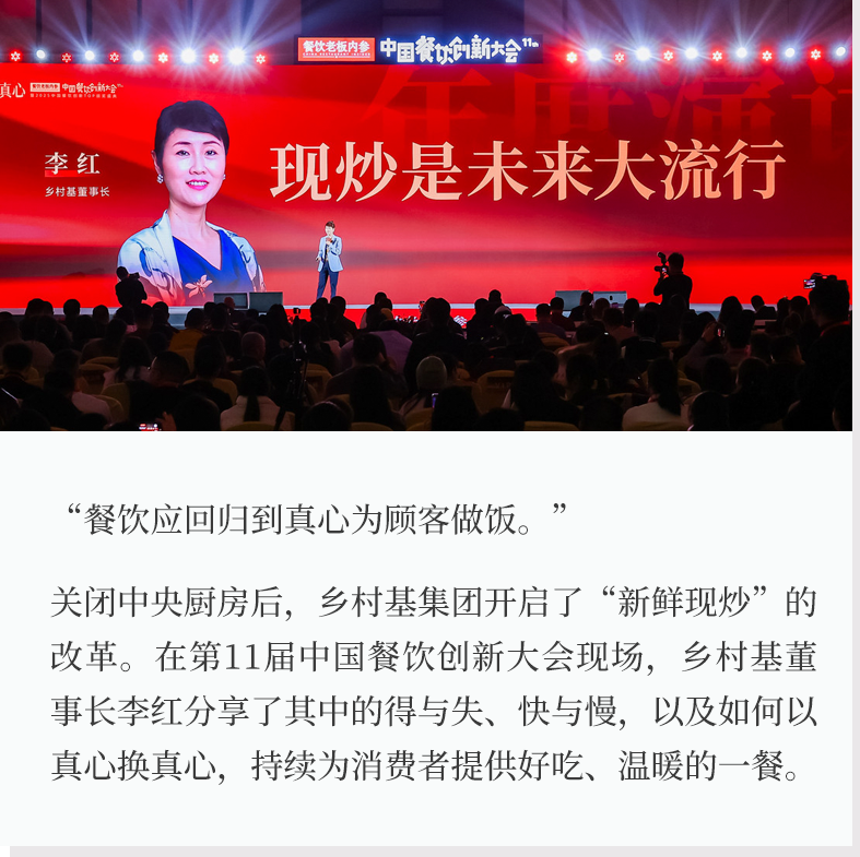 她的答案是餐饮应该回归到“真心为顾客做饭”。无论品类如何爆发、概念如何更新,餐饮最终要回归食材与工艺的本身。乡村基集团的新鲜现炒还将继续深化。