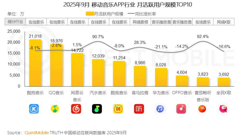 创作者对汽水音乐的重视,与该平台用户迅猛增长有关。调研机构Quest Mobile数据显示,2025年9月,汽水音乐在国内在线音乐APP用户规模排行中位列第四,MAU(月活跃用户数)为1.2亿,同比增长90.7%,前三名则是酷狗音乐(2.1亿)、QQ音乐(1.9亿)和网易云音乐(1.5亿)。