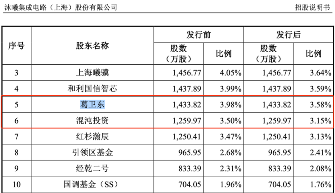 其中,葛卫东及旗下混沌投资早在2025年初便已通过直接持股和多轮增资参与布局沐曦股份,合计持股数量达2693.79万股,占发行后总股份的6.73%。以开盘价计算,其持股市值高达188.58亿元。