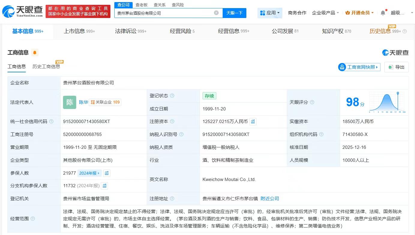 红星资本局12月17日消息,天眼查显示,近日,贵州茅台酒股份有限公司(下称“贵州茅台”,600519.SH)工商信息发生变更,公司法定代表人已由张德芹变更为陈华。