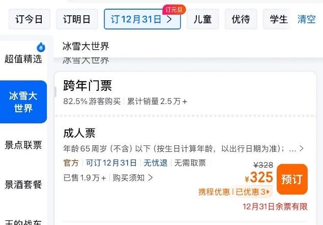 哈尔滨冰雪大世界“跨年夜”门票十分抢手。(图片截自携程App)