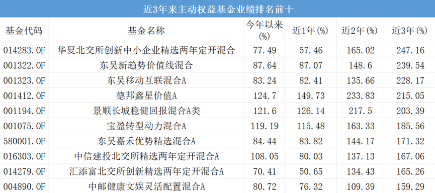 其中,有5只产品收益率超过200%,分别为华夏北交所精选两年定开混合、东吴新趋势价值线混合、东吴移动互联混合、德邦鑫星价值灵活配置混合和景顺长城稳健回报混合,收益率分别达到247.16%、239.54%、228.17%、215.05%和203.39%。
