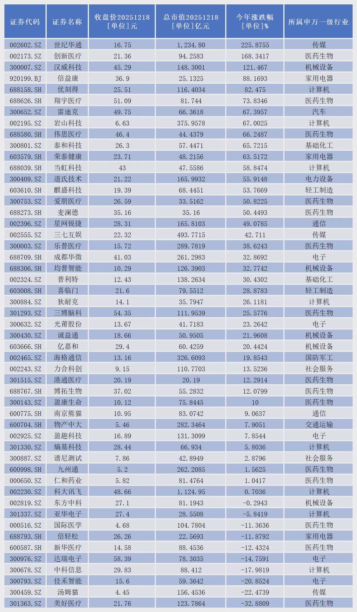 世纪华通、创新医疗、汉威科技3家公司分别以225.88%、168.34%、121.47%的涨幅位居前三。