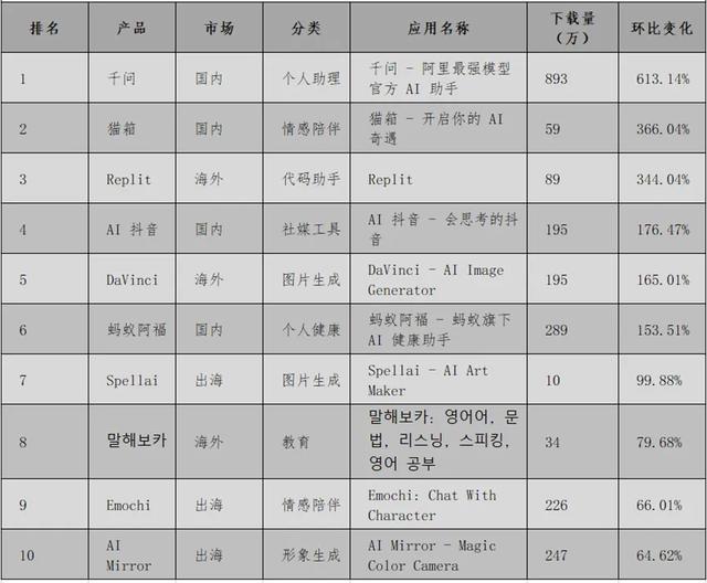 2025年11月全球AI应用下载量环比增速前10名 数据来源:AI百强榜
