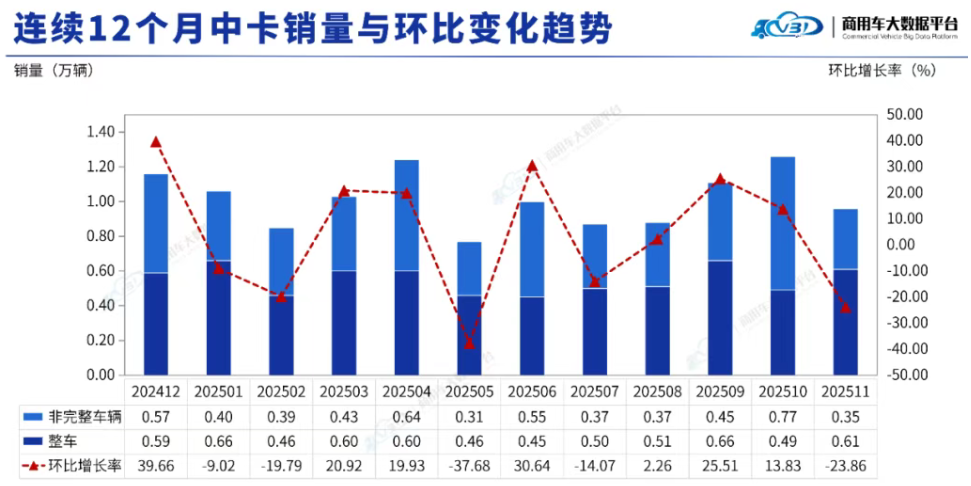 我国拥有全球最大的商用车市场,数据显示:2025年全国1-11月中卡的累计批发销量为11.03万辆,同比下滑了4.87%,整体表现不佳。
