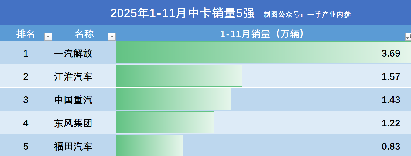 另附:2025年1-11月中国中卡1-11月批发销量5强,数据源于:中汽协商用车专业委员会。