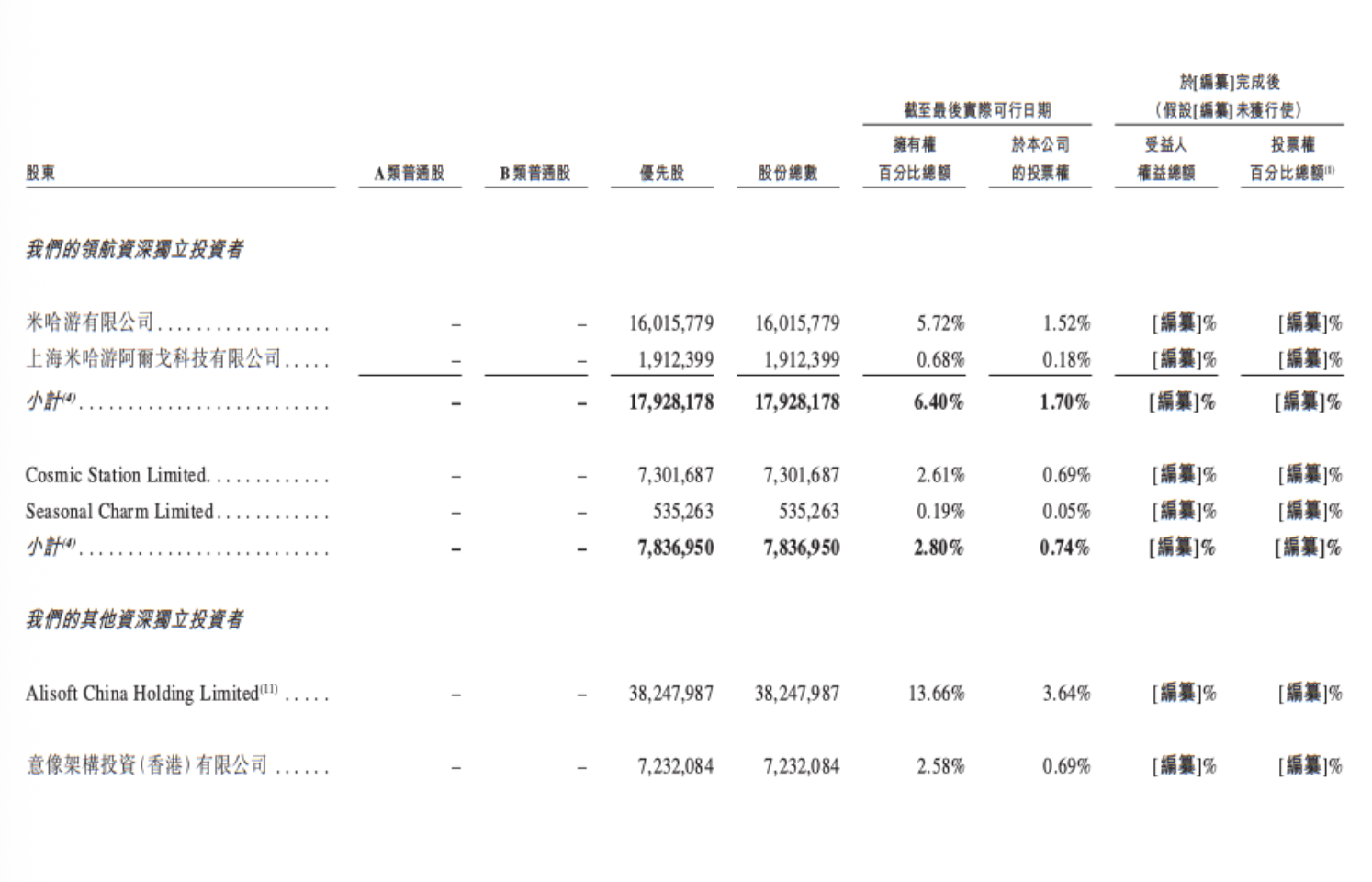 招股书信息显示,阿里巴巴、米哈游、IDG、腾讯是MiniMax的控股股东。目前阿里持股13.66%,米哈游持股6.4%,腾讯持股2.58%。