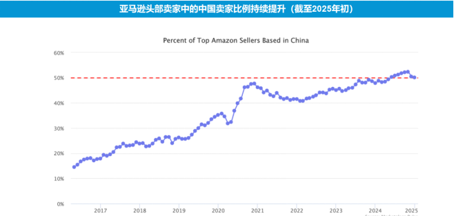 历经疫情等考验,中国供应链的韧性获得全球认可。2025年关税摩擦背景下,中国供应链在高通胀环境中反而成为“硬通货”。Marketplace Pulse数据显示,亚马逊头部卖家中中国卖家占比不降反升,已超过50%,印证了中国制造的全球竞争力。