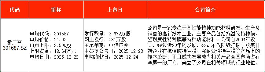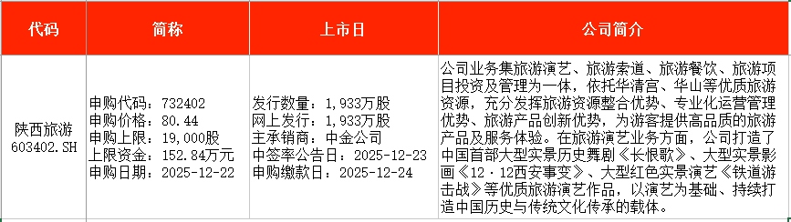 从时间表看,新广益(301687)、陕西旅游(603402)将在本周一(12月22日)申购;蘅东光(920045)将在本周二(12月23日)申购。
