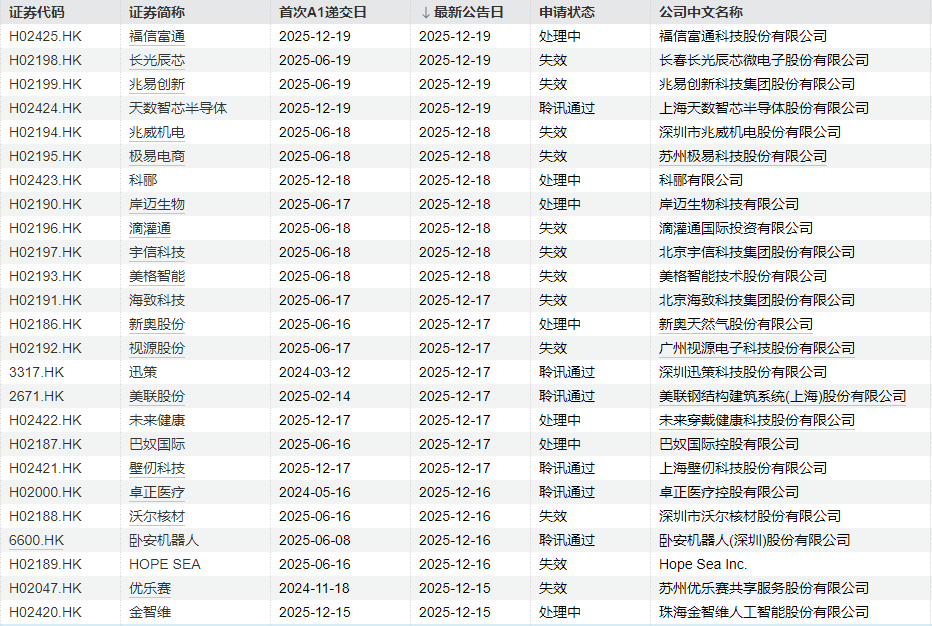 上海天数智芯半导体股份有限公司、深圳迅策科技股份有限公司、美联钢结构建筑系统(上海)股份有限公司、上海壁仞科技股份有限公司、卓正医疗控股有限公司、卧安机器人(深圳)股份有限公司等6家公司的聆讯通过。