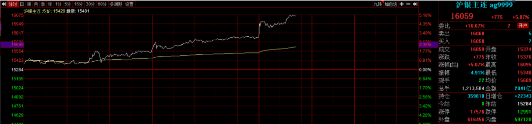 09:50沪银期货主力合约涨超5%,突破16000元/千克关口,续创历史新高。