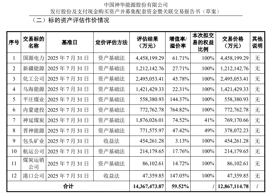 中国神华拟通过发行A股股份及支付现金的方式购买国家能源集团持有的国源电力100%股权、新疆能源100%股权、化工公司100%股权、乌海能源100%股权、平庄煤业100%股权、神延煤炭41%股权、晋神能源49%股权、包头矿业100%股权、航运公司100%股权、煤炭运销公司100%股权、港口公司100%股权,并以支付现金的方式购买西部能源持有的内蒙建投100%股权。