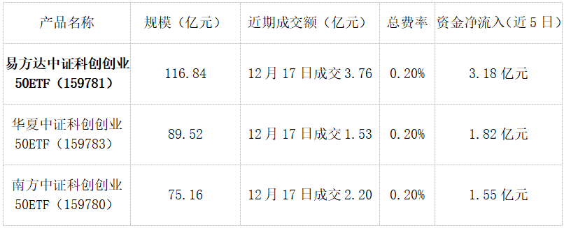 规模够大:截至2025年12月18日,易方达中证科创创业50ETF(159781)最新规模达116.84亿元,在同类科创创业50ETF中稳居前列。规模大意味着基金运作更稳定,不会因大额申赎导致净值波动。