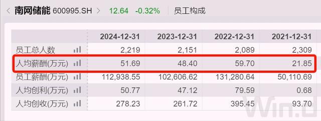 至2024年末,南网储能职工总数大约2200人,去年人均创利约51万元,人均薪酬也超过51万元,比2023年增加3.3万元,但比2022年要低8万元。
