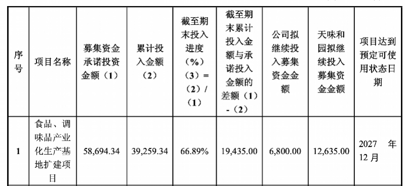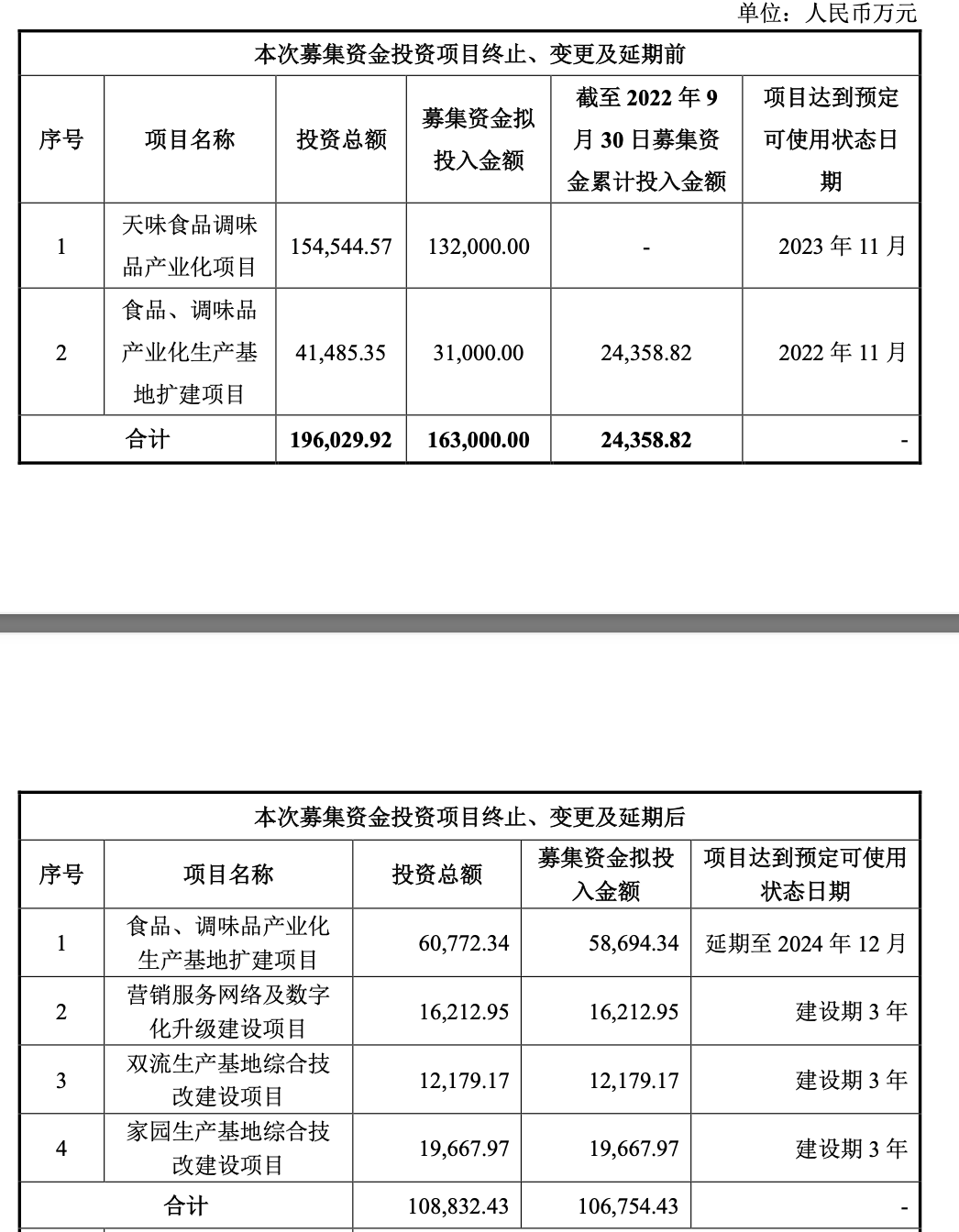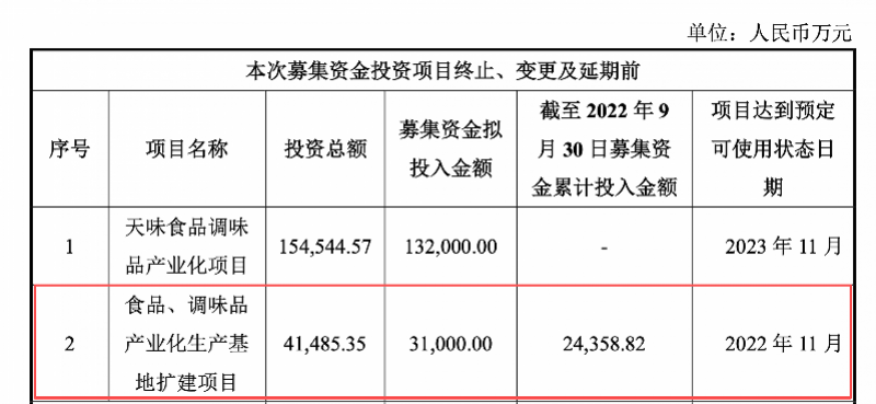 此外,公司另一大定增项目也一同“变卦”了,公司表示要向“食品、调味品产业化生产基地扩建项目”增资2.77亿元的同时,该项目预定可使用状态的时间由2022年11月延期至2024年12月。