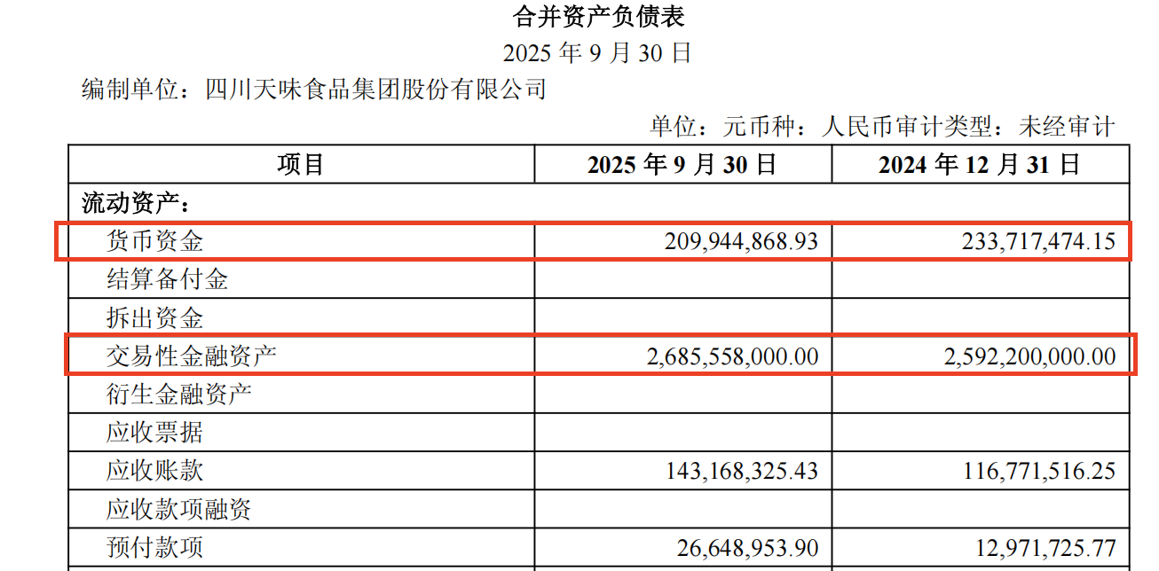上述证监会要求补充说明背后,南都湾财社记者注意到,天味食品躺在账面上的资金相当充足,截至今年9月末,公司货币资金、交易性金融资产分别高达2.1亿元、26.86亿元。