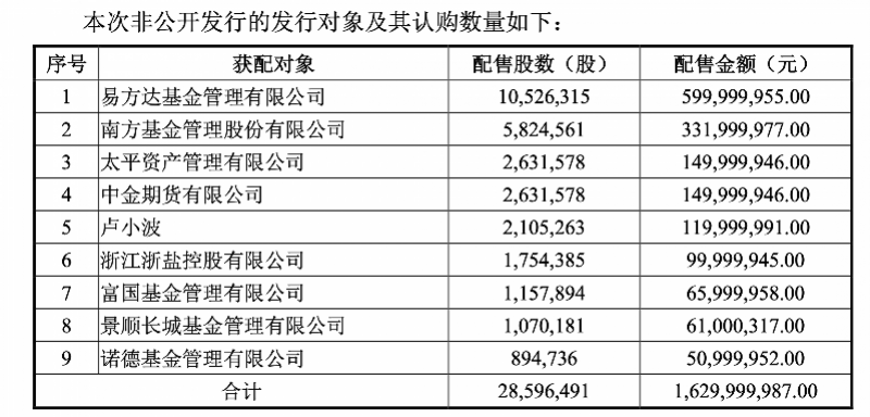 但舆论并未阻挡天味食品募资的脚步,在公司股价接连攀升的背景下,不久后,公司便确定了定增对象,包括易方达基金管理有限公司、南方基金管理股份有限公司、太平资产管理有限公司、中金期货有限公司、富国基金管理有限公司等9大投资者参与此次定增,公司也如愿完成了16.3亿元的资金募集,对应的定增价达57元/股。