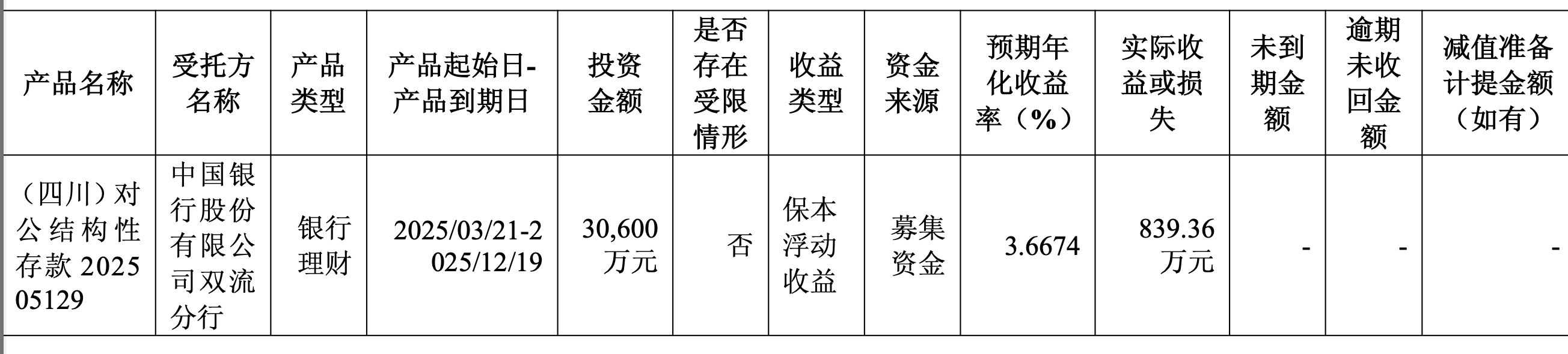 所谓“交易性金融资产”,即主要指“理财产品”。据公司12月20日公告,公司部分理财产品到期,收回本金3.06亿元,获得收益839.36万元。