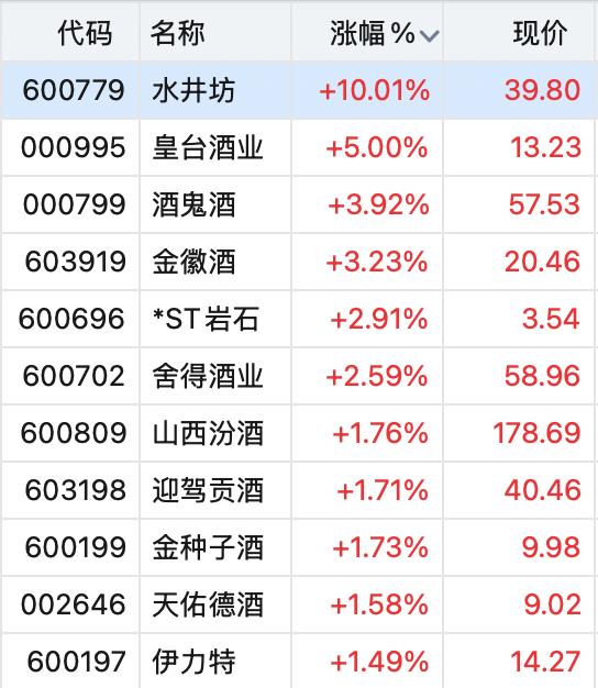 12月25日,白酒股 午后 震荡走高,截至发稿,水井坊涨停,皇台酒业涨5%,酒鬼酒、 金徽酒、 舍得酒业涨幅居前。