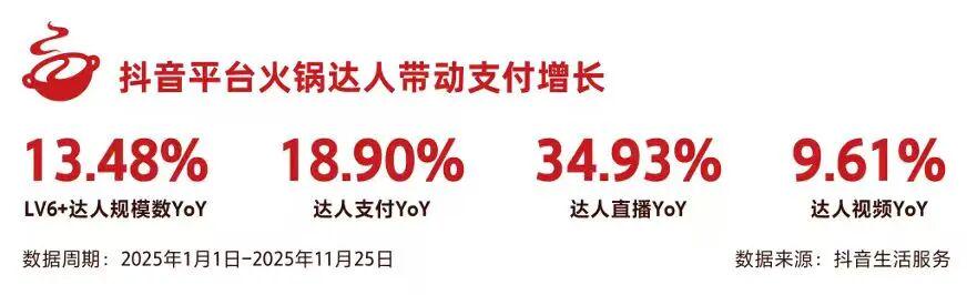 二是,链接优质达人,实现品效合一。达人内容能将火锅产品价值转化为更直观的消费吸引力,降低用户决策成本,带动品牌声量与转化。抖音生活服务数据显示,截至11月25日,2025年火锅相关达人支付同比增长18.9%。