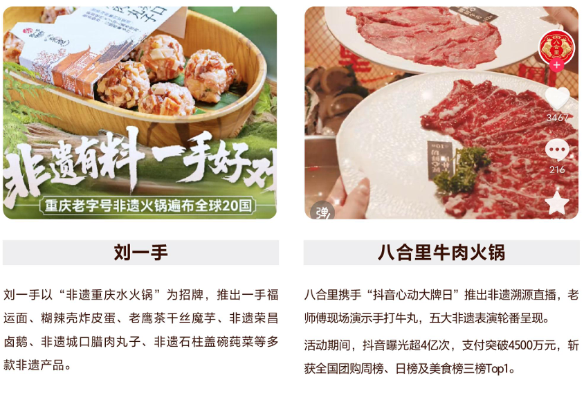 当前,非遗已成为年轻人关注的文化热点,抖音#非遗美食话题播放量超过30亿次。越来越多餐饮品类开始挖掘非遗元素的商业价值。如八合里,携手“抖音心动大牌日”推出非遗溯源直播,活动期间支付超4500万元。