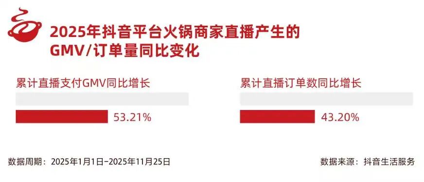 以直播板块为例,抖音生活服务数据显示,2025年1月1日至11月25日,火锅商家直播曝光量同比上涨150.37%,看播次数也同比增长了87.51%。流量持续涌入,自然带动了商家业绩的拉升。同期直播支付GMV同比上涨53.21%,订单数也攀升43.20%。直播现在就是火锅商家实打实的“增长引擎”。