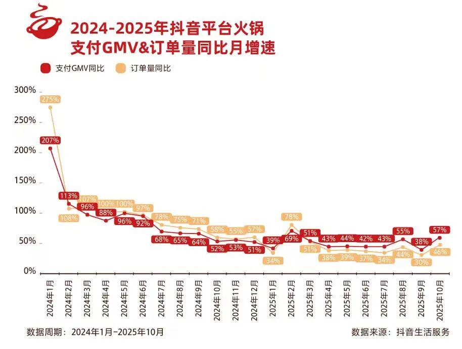 随着火锅行业竞争的加剧,越来越多商家将抖音平台视为重要的增长渠道。抖音生活服务数据显示,2025年1-10月,火锅品类动销门店数同比月增长率保持在15%-26%区间,其中2月增长率达26.58%。此外,2024年1月至2025年10月,抖音平台火锅支付GMV&订单量同比月增速均保持在30%以上。