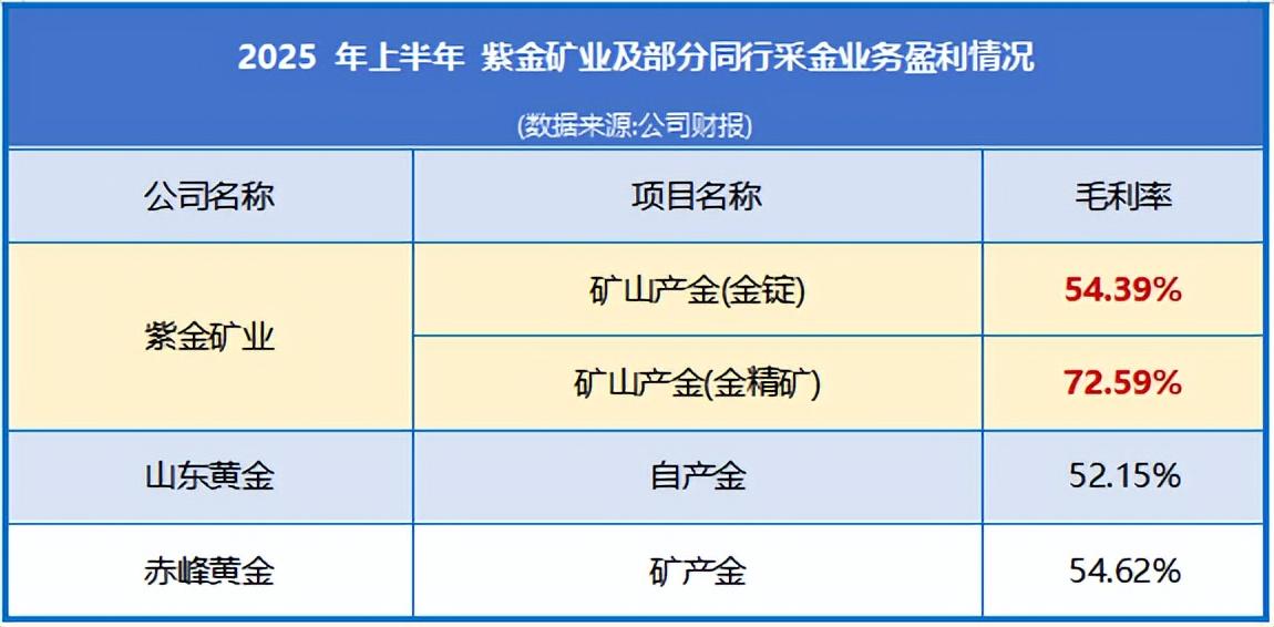 2025年上半年,紫金矿业金锭毛利率为54.39%,金精矿的毛利率更是达到了72.59%,综合毛利率为63.49%,远超山东黄金、赤峰黄金等同样有采金业务的同行。