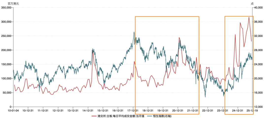 图:恒生指数走势、港交所主板日均成交额