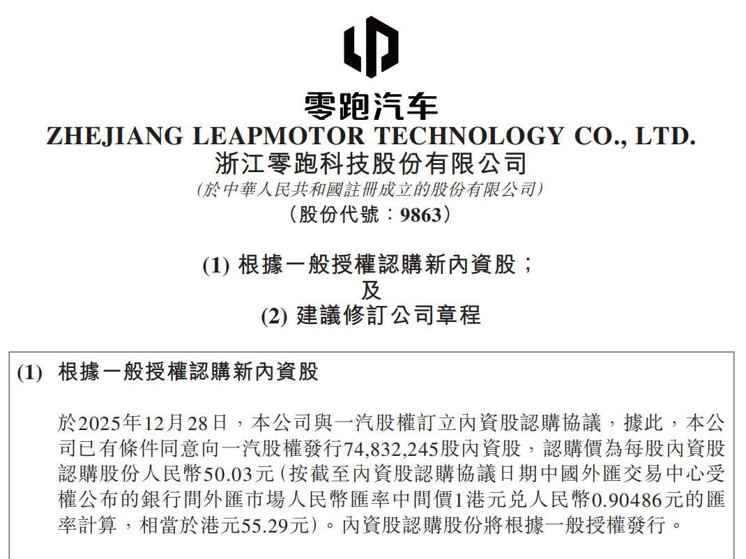 12月29日,零跑汽车发布公告称,12月28日,其与中国一汽全资附属公司一汽股权投资(天津)有限公司(下称“一汽股权”)订立内资股认购协议,计划以每股50.03元的价格发行7483.22万股内资股,总筹资约37.44亿元,其中约50%将用于研发投入,约25%将用于补充营运资金及一般公司用途,约25%将用于扩大销售及服务网络并增强品牌知名度。