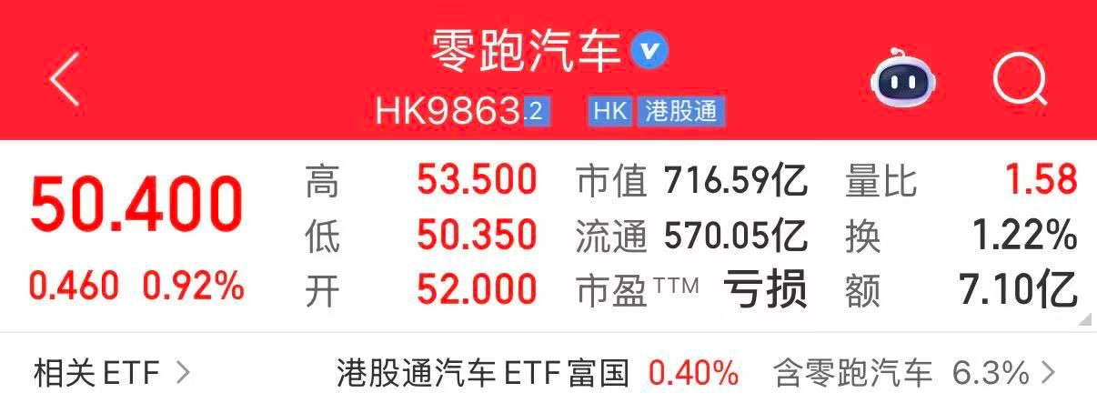 公告发布后,零跑汽车股价早盘高开,一度涨超6%,达53.5港元/股,截至29日收盘,报50.4港元/股。而从交易细节看,此次认购价较协议签署前零跑最后一个交易日收盘价49.94港元及前五个交易日平均收盘价49.23港元均有溢价。