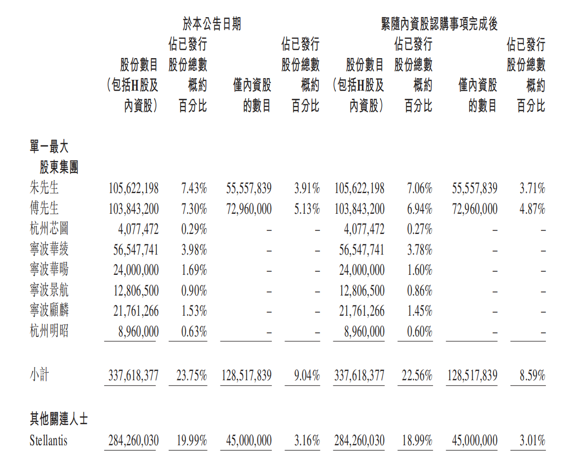 股权架构方面,公告显示,7483.22万股内资股相当于零跑汽车已发行内资股总数的约25.74%、经扩大已发行内资股的约20.47%;相当于已发行股份总数的约5.26%,以及经扩大已发行股份的约5%。而在本次认购完成后,零跑科技创始人、董事长、CEO朱江明及股东傅利泉所属的单一最大股东集团合计持有公司股份比例从23.75%降至22.56%,持股数不变,斯泰兰蒂斯(Stellantis)占总股份比例则由19.99%降至18.99%,持股数同样不变。