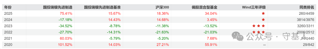 Wind数据显示,国投瑞银先进制造连续三年大幅亏损且排名同类产品倒数,其中2022年亏损27.7%,2023年亏损幅度扩大至34.52%,2024年在市场全面反弹的背景下依然亏损17.18%。
