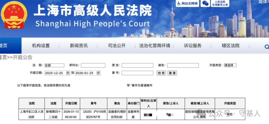 投资者李某以“金融委托理财合同纠纷”为由,将国投瑞银基金与施成共同诉至上海市虹口区人民法院,案件已定于2026年1月13日正式开庭审理。