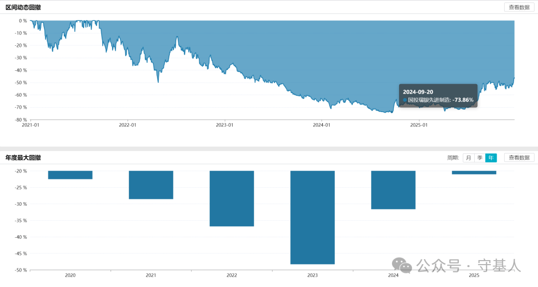 从净值回撤来看,该基金自2021年下半年开启回调后,最大回撤幅度高达73%,其中2023年单年度最大回撤接近50%。