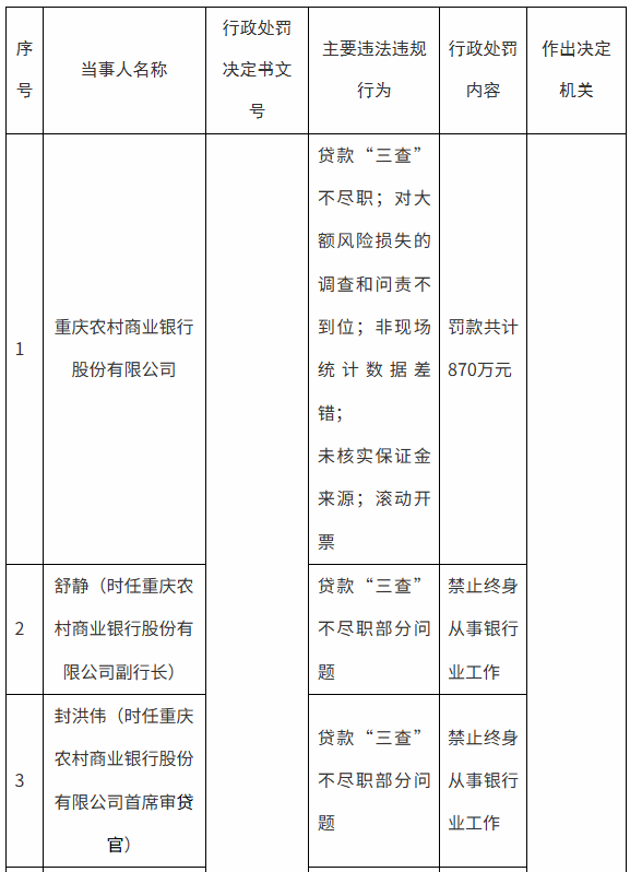 近日,重庆农商行(601077.SH)因5项违规行为收到870万罚单而被推至聚光灯下,这张罚单直指该行信贷审核领域的重大违法违规行为,创下近三年来罚款金额之最。在金融监管“双罚制”下,10名责任人也被处以相应处罚,还有2名被终身禁业,值得注意的是,被罚者中,原副行长舒静在2024年3月已被解聘,后因严重违纪违法被“双开”。