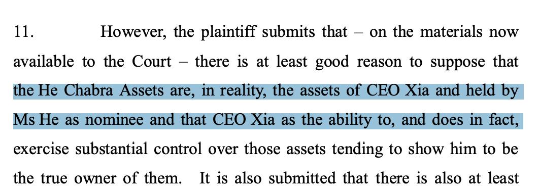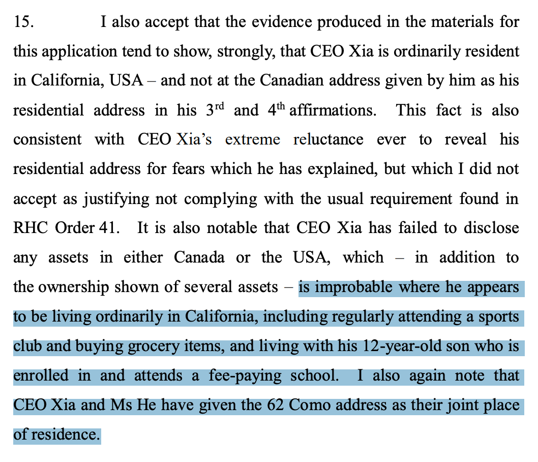 法庭也信纳,何女士只是夏海钧资产的代理人,另有证据显示夏海钧常居美国加州,并定期参加当地的体育俱乐部及购买日用品,又与其12岁儿子同住,他儿子就读于加州当地的一所私立学校。夏海钧亦与其妻子共用地址「62 Como」,而非此前声明中提供的加拿大地址。夏海钧隐瞒其美国以个人名义持有的各种资产,表明他面临严重的资产流失风险等。