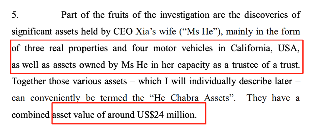 据原告恒大调查,其妻子何女士在美国加利福尼亚州持有三处房产和四辆汽车(3辆特斯拉和1辆梅赛德斯SUV),并且还持有信托资产(何女士作为受托人于2023年成立的信托,名为“新生活可撤销信托”(New Life Revocable Trust)),这些资产总价值高达2400万美元。