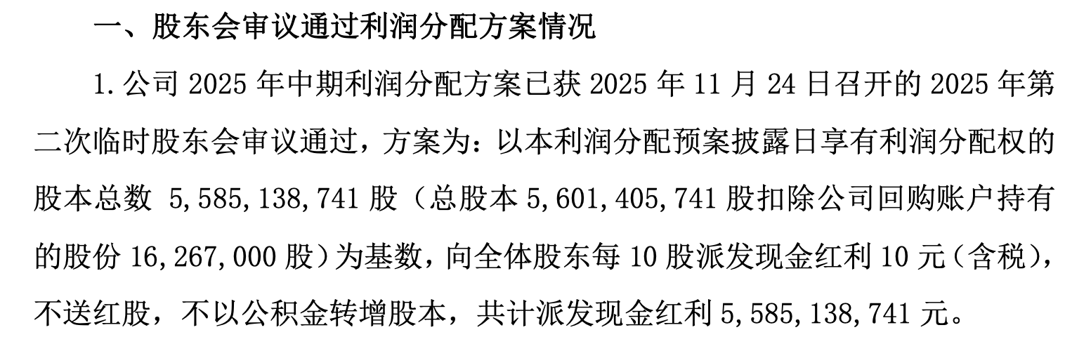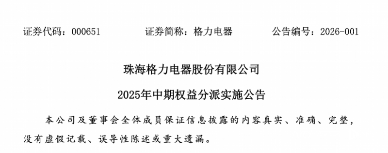 此前格力电器于2025年10月公布2025年中期利润分配预案,该方案已获2025年11月24日召开的2025年第二次临时股东会审议通过。当时格力电器表示,2025年前三季度实现归属于上市公司股东的净利润214.61亿元,净利润率稳中有升,盈利能力稳健,现金流充裕,为实施中期分红奠定坚实基础。2025年中期利润分配预案有利于增强投资者回报,保持公司分红政策的稳定性和持续性,符合公司正常经营及长远发展需要。
