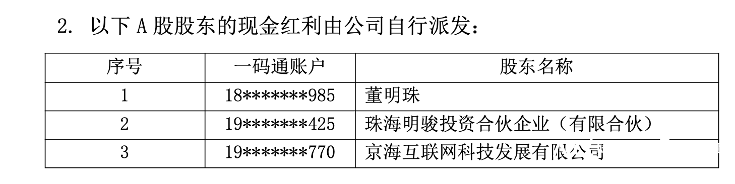 值得一提的是,公告还特别提醒,格力电器董事长董明珠、珠海明骏投资合伙企业(有限合伙)、京海互联网科技发展有限公司这三位公司A 股股东的现金红利由公司自行派发。