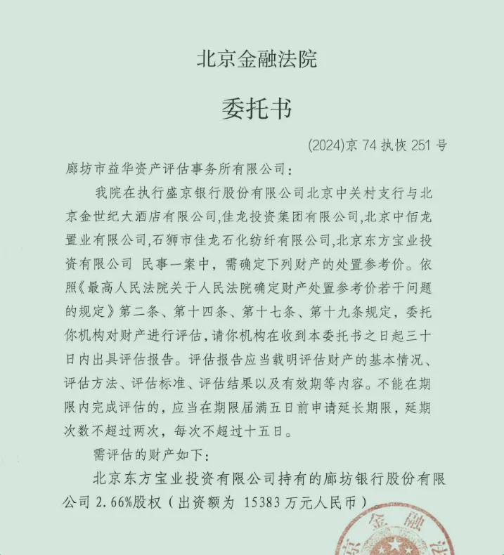 据评估报告披露的信息,上述股权拍卖涉及的是盛京银行北京中关村支行与北京金世纪大酒店有限公司、佳龙投资集团有限公司、北京中佰龙置业有限公司、石狮市佳龙石化纺纤有限公司、北京东方投资的民事案件,执行案号为(2024)京74执恢251号。