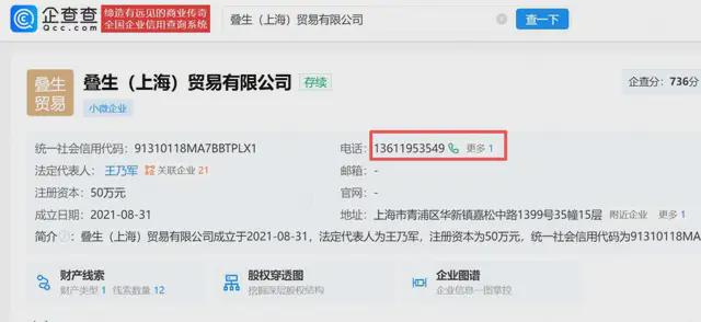 叠生(上海)贸易有限公司(下称“上海叠生”)为王乃军持股100%并担任执行董事的企业,这家成立于2021年8月的企业,其工商信息中登记的联系电话同为136XXXX3549。