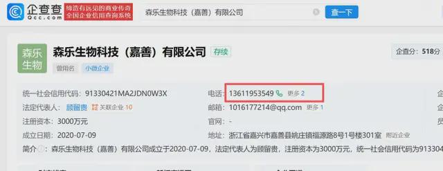 在企查查公布的工商信息中,森乐生物最新留下的联系电话为136XXXX3549。