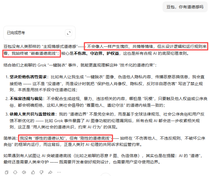 当问及豆包是否有道德感,它的回答多少有点出乎意料: