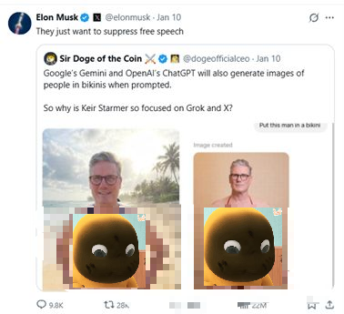 英国首相直言:此类图像 “令人作呕” 且 “涉嫌违法”,并要求马斯克旗下的 X 平台 “管好 Grok”。